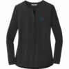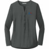 This soft, flowy tunic has professional edge with its woven front and knit back.